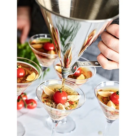 L’Entonnoir à piston fushia DeBuyer décore les assiettes d’un filet de sauce, garnit les mignardises, remplit les verrines avec précision, etc … Pratique, la poignée permet de facilement doser le débit. Il est muni d’un support en inox et silicone pour poser l’entonnoir lors du remplissage ou en cours de réalisation.