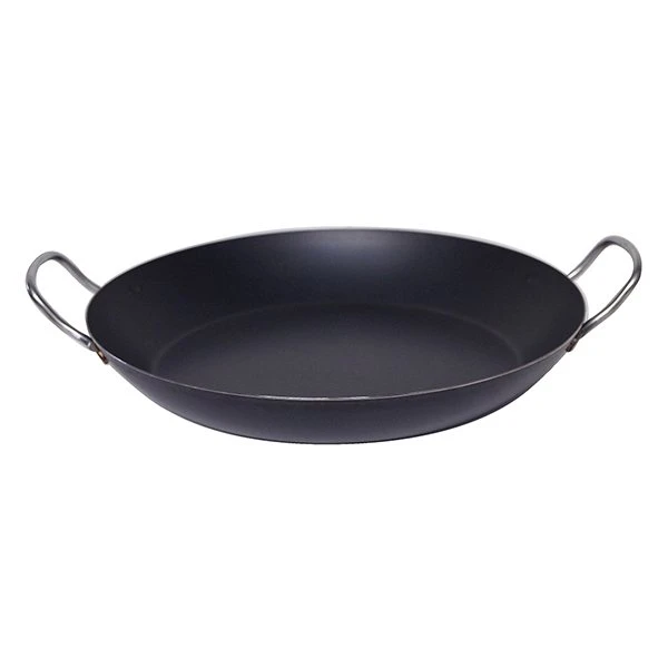 Cette poêle à paëlla en tôle d’acier 42 cm est idéale pour préparer des plats familiaux en grande quantité comme les paëllas, les choucroutes… mais aussi pour saisir, griller ou dorer des émincés de viandes, de poissons ou des oeufs. En tôle d’acier bleuie par traitement thermique, cette poêle offre une protection contre l’oxydation et ne dispose d’aucun revêtement. Sa coupe lyonnaise permet de faire glisser facilement les aliments et de la manier sans effort. La tôle d’acier permet une montée rapide en température et le culottage progressif donne une anti-adhérence naturelle. Ses deux anses permettent de déplacer la poêle facilement, même quand elle est remplie !