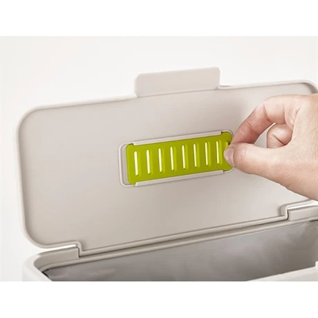 Ce bac à compostage compact est conçu spécifiquement pour faciliter la récupération des déchets alimentaires. Doté d’un couvercle rabattable pratique et d’une ouverture extra large, il est idéal pour recueillir les restes de nourriture directement dans les assiettes. L’évent d’aération réglable au niveau du couvercle permet d’évacuer l’humidité : réduisant ainsi la formation d’odeurs ou, par temps chaud, fermé pour empêcher les insectes de pénétrer. Peu encombrant, il se range facilement sur le plan de travail ou dans un placard et sa fixation vous permettra même de le monter sur une de vos portes de placard !