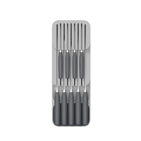 Optimisez la place dans vos tiroirs en rangeant vos couteaux astucieusement grâce au range couteaux compact 2 niveaux ! Ce range couteaux permet de ranger jusqu’à 9 couteaux. Le niveau du haut pourra accueillir les petits couteaux et le niveau du bas les grands couteaux. Design et pratique, il libérera de la place dans vos tiroirs pour y disposer d’autres ustensiles plus volumineux. Les pieds du range couteaux sont antidérapants pour éviter qu’il en glisse lors de l’ouverture et de la fermeture du tiroir.
