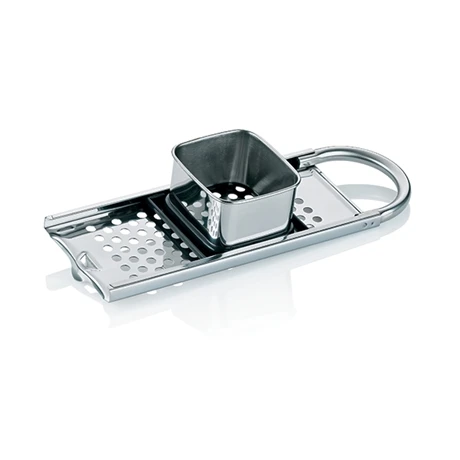 La mandoline est en inox 18/10 et le réservoir à pâte qui coulisse sur la râpe est amovible pour un entretien facilité.