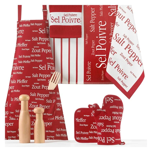 La marque Winkler fabrique du linge de cuisine pour protéger vos vêtements des tâches et éclaboussures ; le torchon jacquard en lin et coton et le tablier 100% coton Sel & Poivre en version rouge sont modernes et rempliront parfaitement leur rôle.